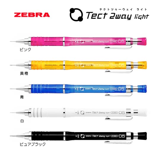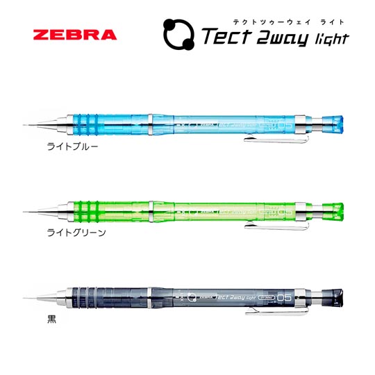 軸中央を右へ回すと振るだけで芯が出るフリシャ機能が使え、軸中央を左へ回すと軸内部の重りが固定され安定した筆記が出来る便利な2WAYタイプのシャープペン ゼブラ テクトツゥーウェイ ライト。フリシャ機能は振るだけで芯が出てくるので、ノックする手間が掛からずスムーズに芯が出てきます。一方フリシャ機能をOFFにするとでペン先にある程度の重さが固定されるので筆跡がずれずに力をあまり加えることなく書くことが出来ます。カラーバリエーションも豊富で安定した筆記が出来る人気の商品です。こちらは一般的な0.5mm芯になってます。