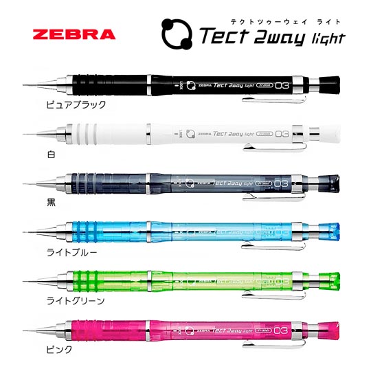 軸中央を右へ回すと振るだけで芯が出るフリシャ機能が使え、軸中央を左へ回すと軸内部の重りが固定され安定した筆記が出来る便利な2WAYタイプのシャープペン ゼブラ テクトツゥーウェイ ライト。フリシャ機能は振るだけで芯が出てくるので、ノックする手間が掛からずスムーズに芯が出てきます。一方フリシャ機能をOFFにするとでペン先にある程度の重さが固定されるので筆跡がずれずに力をあまり加えることなく書くことが出来ます。カラーバリエーションも豊富で安定した筆記が出来る人気の商品です。細かい文字を書くときに便利な0.3mm芯になってます。