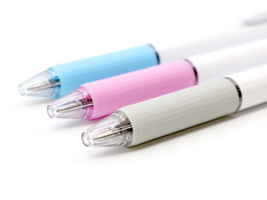 書き味滑らかで長時間使用しても疲れません。エコマーク商品・ISO14001認定取得工場で製造されたグリーン購入法適合商品です。その為環境に配慮した企業イメージをアピールできます。ボールペン本体は名入れが映える白軸になっており金額もお手頃なので名入れノベルティとして最適です。クリップは厚みのある書類やバインダーにも挟みやすいワイドオープンクリップを採用しています。グリップカラーがピンク、ブルー、グレーの3種類あります。