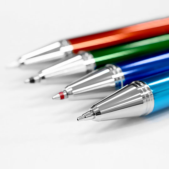 書き出しが良くなめらかに濃く書ける「アクロインキ」搭載多機能ペン! ツープラスワンエボルト 1000です。「アクロインキ」は当社(パイロット)の油性インキに比べ約1/5のインキ粘度です。潤滑剤を配合しペン先でのボールの摩擦抵抗を低減することで回転がスムーズになり、滑らかで濃い筆跡を実現しました。黒・赤2色のボールペンとシャープペンシル3つの機能は、本体をひねり回転させると切り替えることができます。色鮮やかなアルミ素材のボディが美しく本体色が豊富にありますので、ギフトや記念品として大変人気のボールペンです。