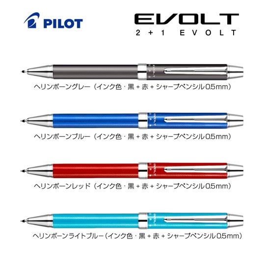 書き出しが良くなめらかに濃く書ける「アクロインキ」搭載多機能ペン! ツープラスワン エボルト 1500です。「アクロインキ」は当社(パイロット)の油性インキに比べ約1/5のインキ粘度です。潤滑剤を配合しペン先でのボールの摩擦抵抗を低減することで回転がスムーズになり、滑らかで濃い筆跡を実現しました。黒・赤2色のボールペンとシャープペンシル3つの機能は、本体をひねり回転させると切り替えることができます。色鮮やかなアルミ素材のボディが美しくドット柄の本体色も取り揃えてありますので、ギフトや記念品として大変人気のボールペンです。