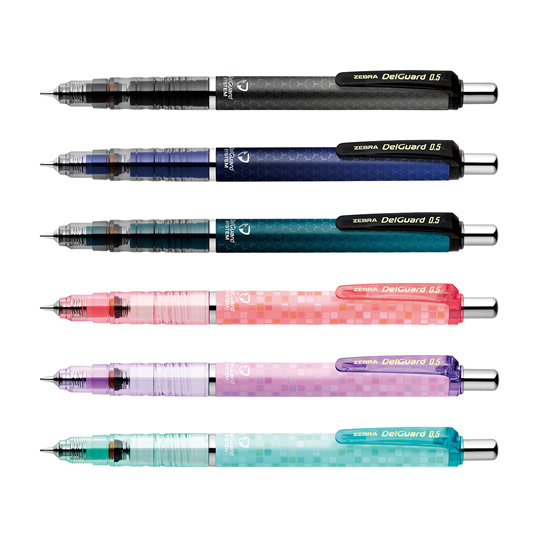 芯の折れないシャープペン・デルガードに新色登場!シャープペンを使用する利用者で”シャープ芯が折れたり詰まったりする”というのが最も多い不満でした。そこでゼブラが学生の行動観察を実施し、シャープ芯が折れる状況を把握。筆記中のあらゆる角度の強い筆圧からも折れないように芯を守り、軸内部にシャープ芯を誘導する部品を取り付け短い芯でもずれて詰まることのないデルガードシステムを考案。それによりシャープペンの芯折れや芯詰まりを防ぐことが可能になりました。シャープペンを使う機会の多い中高生には欠かせない1本です。本体色は6色と豊富にありますのでお気に入りが見つかります。
