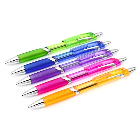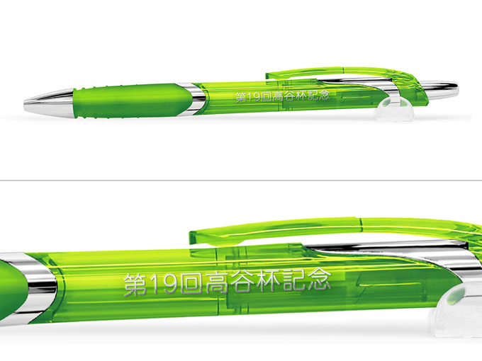 ボールペン本体はペン先・ノック部・その他メッキのアクセントが多数あり、価格以上の質感でお渡しする方にも十分満足していただけます。ペンのカラーはポップな5色で50本単位でお好きな色をお選びいただけます。名入れ文字は「白」の印刷カラーで印字すると、とても綺麗な仕上がりになります。ビジネス・イベントなど、どのようなシーンにもご利用いただける名入れボールペンです。