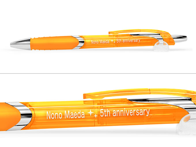 ボールペン本体はペン先・ノック部・その他メッキのアクセントが多数あり、価格以上の質感でお渡しする方にも十分満足していただけます。ペンのカラーはポップな5色で50本単位でお好きな色をお選びいただけます。名入れ文字は「白」の印刷カラーで印字すると、とても綺麗な仕上がりになります。ビジネス・イベントなど、どのようなシーンにもご利用いただける名入れボールペンです。