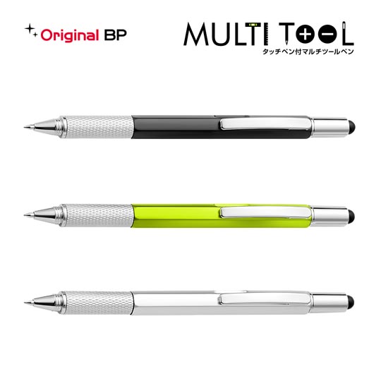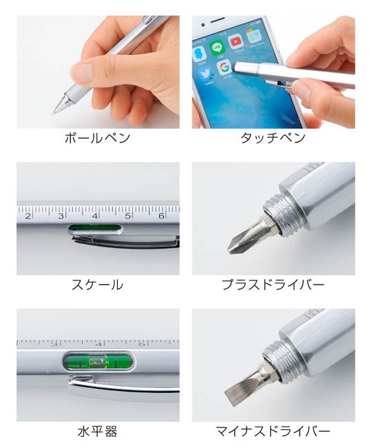 1本に5つの機能を集約した便利な多機能ペン タッチペン付マルチツールペン。スリムでスタイリッシュなフォルムなのにボールペン・タッチペン・スケール・水平器・プラスドライバー・マイナスドライバーと5つもの機能がこの1本に搭載された他にはない珍しいペンになっています。「ボールペンにそんな機能はいらないのでは?」と思われる方もいるかと思いますが、これが近くにあると意外なほど便利。特にスケールはちょっと何かのサイズを調べたい時にとても役立ちます。また、ドライバーや水平器を使用する頻度の高い建築関係・電気工事関係等に携わる方からも好評を頂いております。渡す相手によってはとても喜んでもらえるユニークなタッチペン付きマルチツールペン。多機能ながらお求めやすい価格で、デザインもすっきりとまとまっている名入れボールペンです。