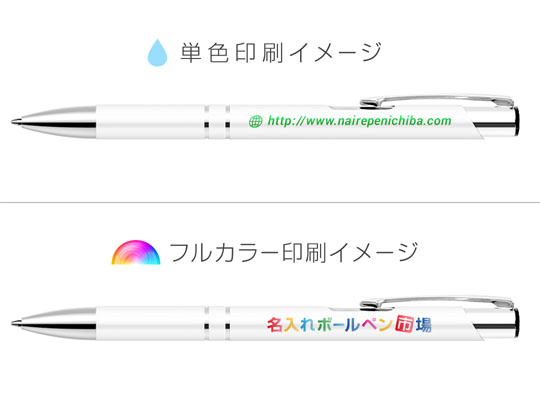 名入れボールペン市場人気NO1のメタリックONEに、フルカラー印刷対応の白軸が登場しました。多彩な色が表現可能なフルカラー印刷で、会社やお店のロゴをカラフルで目立つように印刷したり、グラデーションのかかった文字を印刷したりと、よりおしゃれにかっこよく名入れすることができます。白軸の本体は、印字した名前やロゴがとてもきれいに映えるので、名入れボールペンの作成に特におすすめの本体カラーです。メタリックONEはボールペンの書き心地にもこだわって作成しているので使いやすく、スタイリッシュなデザインと相まって渡した人にもきっと喜んでもらえます。気に入って長く使ってもらえるのでフルカラーで美しく名入れした文字は、多くの人の目に入ることでしょう。装飾の入った真っ白な本体にお客様独自の名入れをして、よりオリジナリティのある名入れボールペンを作成してはいかがですか?
