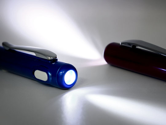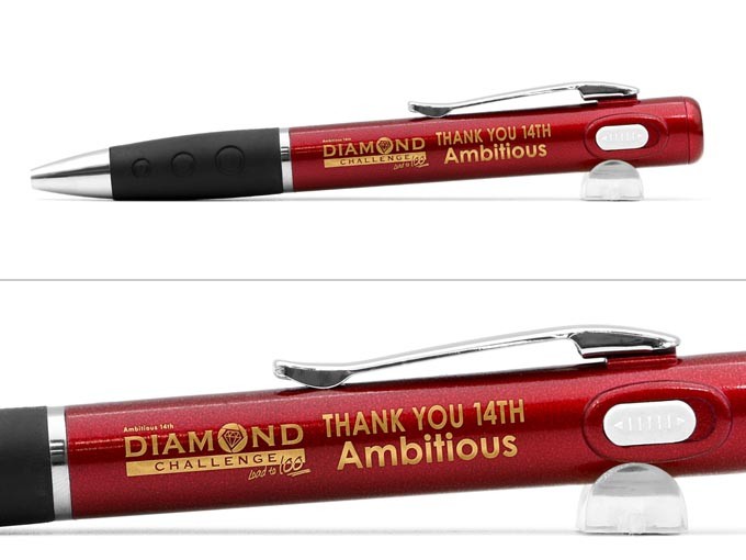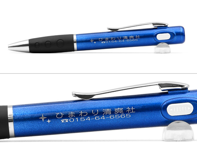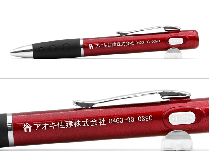 電池やLED電球を搭載しているにもかかわらず、樹脂製ですのでとても軽く扱いやすさも抜群。さらに高級感を醸し出すマット塗装を施しておりますので、一目見ると金属製ボールペンと見間違う質感も魅力的です。0.7㎜の芯はドイツ製のインク使用ですので、書き心地にも納得です。印刷サイズも広く、2行での名入れや企業のロゴやマークの印刷にも適しております。シンプルなデザインに印刷した名前はとても良く目立ち、アピール力があるのでノベルティ・販促品の名入れボールペンにおすすめの1本です。