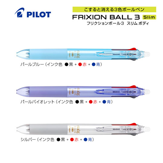 何度も書けて何度でも消せるノック式フリクションボールペン。筆跡を専用ラバーでこすることで、インクの色が透明になり消しカスもでないのでとっても便利。1本で3色を使い分けでき、ビジネスや学業、プライベートまでどんな場面にもお使いいただける人気の商品です。従来の3色ボールペンより、ボディがスリムになったのでバッグやスーツ、手帳のペン差しなどにも収まりやすくなっております。ボールペン軸は0.38mmと細くなっているので、細かい文字も書きやすくなっています。インク色は黒、赤、青のベーシックな3色です。