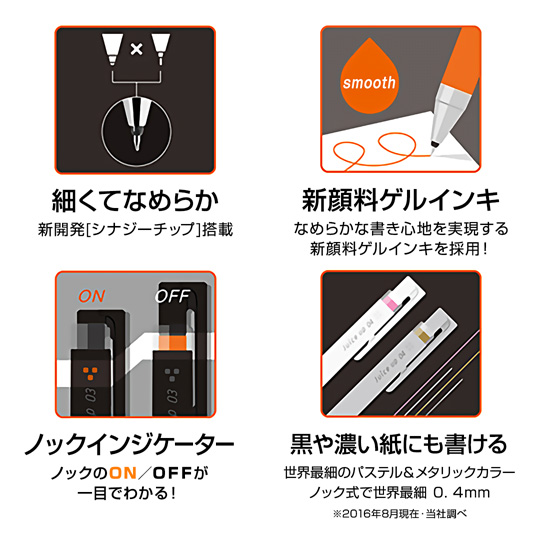 黒や濃い紙にも書ける世界最細のパステルカラーインクとなっており発色がとても綺麗です。細書きに最適な細いパイプ形状のペン先でありながら、ペン先が曲がりにくくなめらかな筆記ができます。特に手帳やノートへの細かい筆記に適したボールペンとなっております。