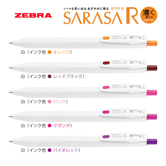 人気のカラフルなジェルボールペン「サラサ」シリーズから、従来品より濃いインクのペン 「サラサR 0.4mm」が登場。近年ボールペン市場では、油性インクより濃くあざやかな筆記線と、インクのカラーバリエーションが豊富なジェルインクの人気が高い傾向にあります。特に学生がノートを取る際、重要なところを目立たせたりするのに多く使われています。サラサRは従来品と比べてさらに濃くあざやかに書けるインクを採用しました。さらさらとした書き心地はそのままに、濃いインクを搭載したボールペンで書くことで、きれいで見やすいノートが仕上がります。またボールペン芯が0.4mmと極細となっておりますので手帳やメモ帳にも分かりやすく書くことが出来ます。本体は白を基調としたデザインですので、他のアイテムと合わせやすいボールペンです。ノック部分とクリップの一部にインク色を表現していますので、筆箱の中やペン立てでも見分けやすくなっております。本体毎にインク色が違っておりますのでお好みのインク色を選ぶことが出来ます。
