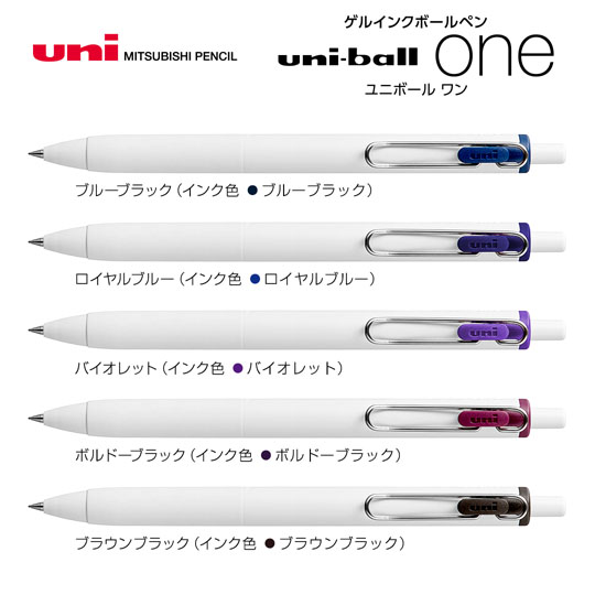 日本が誇る三菱UNIの国産ボールペンです。新しく開発された『uni-ball one(ユニボール ワン)』のインクは、一般的なゲルインクと異なり、色材の紙繊維への浸透を極力抑える新技術ビーズパック顔料を使用した新インクになっております。しかも!にじまず、速乾性の高いインク!!細さ0.38㎜でも一層色濃い文字が書け、文字やイラスト・絵を描くのが楽しくなります。見た目はシンプルなストレートボディになっており、ノートや手帳に挟みやすく可動式のバインダークリップが付いて機能性も兼ね備えた仕様のボールペン。9.6gという軽量設計なので長時間使っても疲れにくい点も魅了の一つです。カラーも全20色取り揃えていますので色を選ぶのも楽しくなります。黒はより濃く、カラーはより鮮やかに発色するので印象に残る文字を書く事ができます。