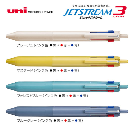 「クセになる、なめらかな書き味。」でお馴染みのジェットストリームシリーズから最もよく使う黒インクには、リフィルチューブを肉薄化することで通常品に比べインク量を約70%増量した「長持ちリフィル」を搭載したジェットストリーム 3色 0.5mm(Newバージョン)が登場しました。従来の画期的なインク(筆記荷重、速度にかかわらず低い筆記抵抗でなめらかに書けます。また濃くはっきりとした描線を書くことができ、速乾性にも優れています。)はそのままで、新たに迷うことなく黒をノックすることができる後端ノックの新機構を採用しました。赤・青インクはこれまでと同じスライドノックですが、新機構によりどのインク色が繰り出された状態でも、色の繰り出しと解除が可能です。本体色は淡い感じの色合いとなっておりますので職場、自宅、学校等どのシーンでもお使いになれます。