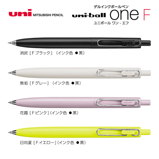 このたび新開発した新技術ビーズパック顔料を使用した新インクを搭載したユニボールワン Fシリーズ 0.38mmが登場。新インクは一層色濃い文字が書け、 記憶に残りやすい効果が実証されたゲルインクボールペンです。一般的なゲルインクと異なり、色材の紙繊維への浸透を極力抑える、新しい顔料を使用しており、従来の色材を粒子中に閉じ込めた独自開発のビーズパック顔料です。 インクの色材となる顔料を粒子中に閉じ込め、粒子のサイズを大きくすることで、色材の紙面への浸透を極力抑えます。それにより、紙面上の色材が本来の色を発色し、黒はより濃く、カラーはより鮮やかに発色することが出来ます。リフィルを保持する先軸に寸法精度を高めた金属製のペン先を採用しており、低重心で安定した、よりなめらかな書き味を実現した「スタビライザー機構」搭載しています。軽い力で安定してスラスラ書くことができるため勉強やメモ書きのみならず、日記などにも適しています。また快適な書き心地だけでなく、ワンポイントの金属製のペン先がデザインのシャープさを際立て、より洗練された上質なボールペンとなっております。