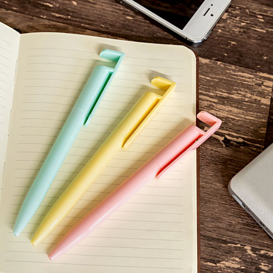 ボールペン本体に抗菌剤を施したスマホスタンド付き抗菌ボールペンの登場です。直接触れるペンだからこそ常に清潔に保つことが出来るなら安心で嬉しいですね。また、クリップ部分上部にはボールペンには珍しいスマホスタンドがついていますのでスマホをサッと置けて動画や映画などを楽しむことも出来ます。本体色はミントグリーン、イエロー、ピンクと可愛らしいパステルカラーをご用意しております。特にお子様向けイベントや女性向け催事などでのノベルティ商品として人気があります。