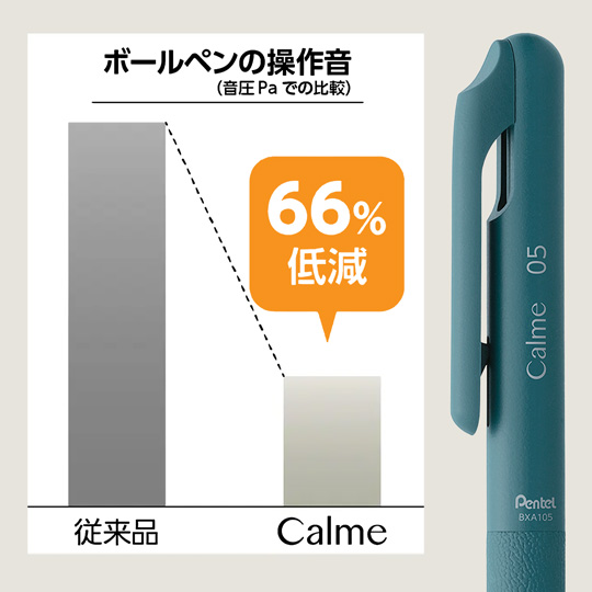 ボールペン特有のノック時の操作音「カチカチ」を抑える静音設計になっているボールペンになります。セミナー、会議、図書館などの静寂な環境の中で今まで気づかいながら使っていた人はもちろん、周りの人にも迷惑を掛けない心配りのできるボールペンになっております。ノック時の操作音を従来品と比べておおよそ66%低減致しました。(ぺんてる比 音圧パスカルで比較)