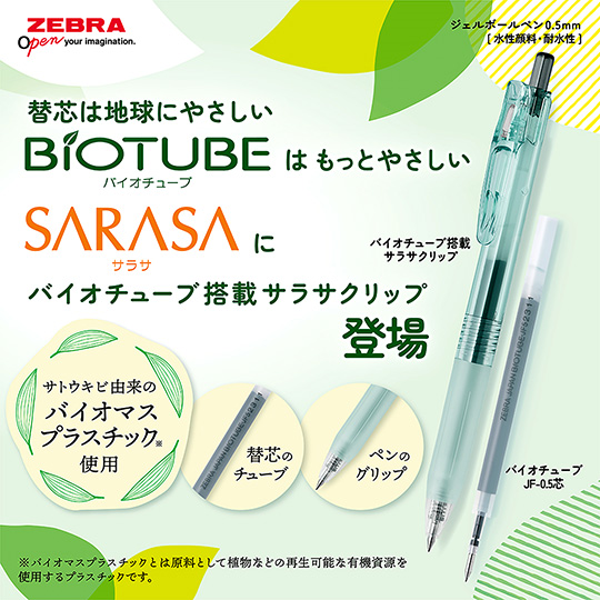 学生から社会人まで幅広い層に人気の高い「サラサクリップ」ですが、ペン本体のグリップにバイオマスプラスチックを使用、その他の部品には再生プラスチックを使用し環境に配慮した「バイオチューブ搭載サラサクリップ」が登場致しました。バイオマスとは「動植物から生まれた、再生可能な有機性資源(石油などの化学燃料を除く)」のことでボールペン使用後に廃棄・焼却する際に放出される「CO₂」の増加を抑えることが出来る環境にやさしい素材となっております。
