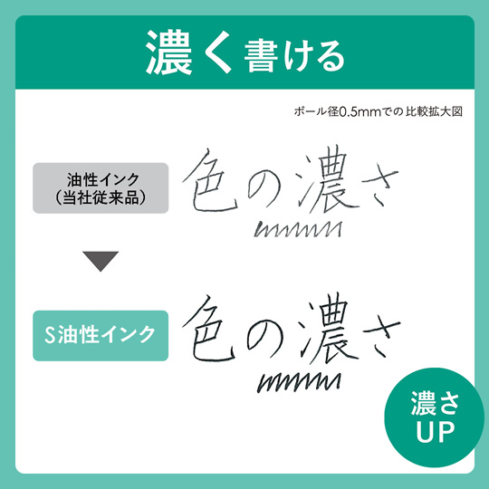 今までの油性インクを改良し従来品よりも筆圧15%ダウンを実現した「S油性インク」を搭載しておりますので、不安定な場所でも力を入れずに濃い筆記が可能です。