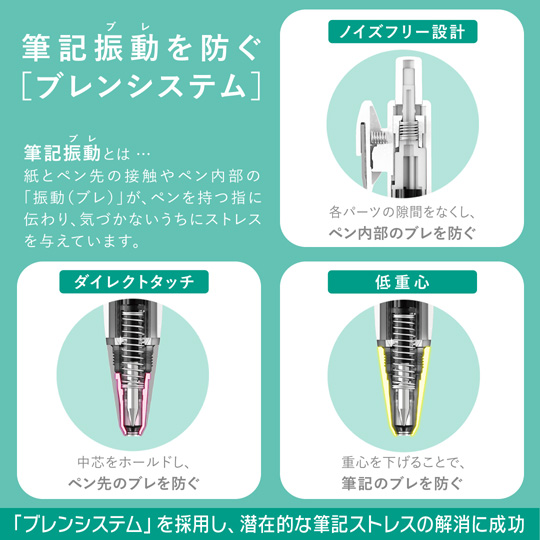 また、筆記振動を防ぐ「ブレンシステム」でブレなく綺麗に書くことが出来まのでより使いやすさを実感していただけるボールペンです。